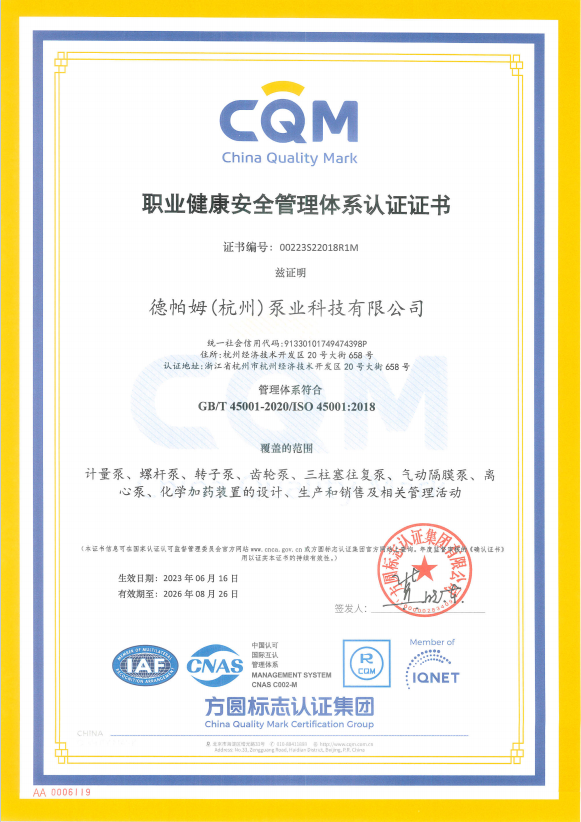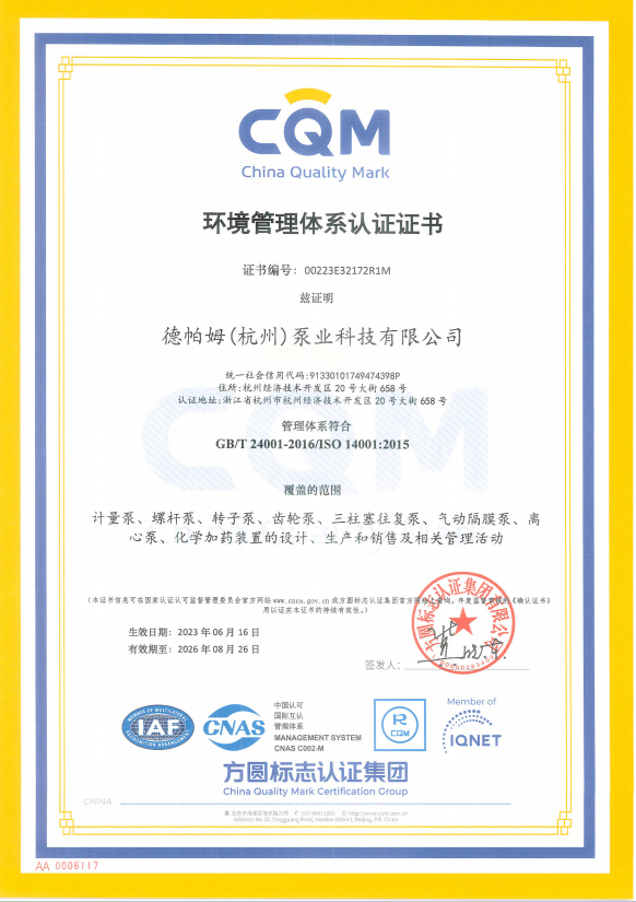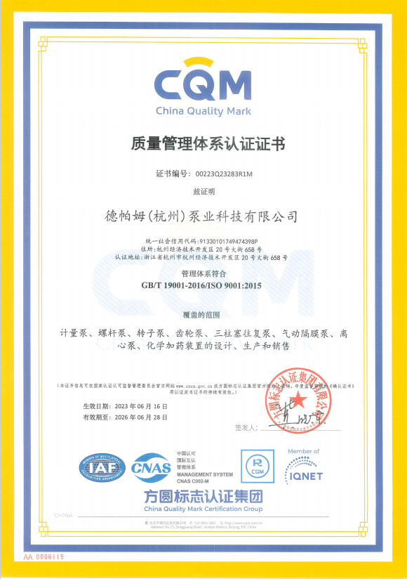德帕姆(杭州)泵業(yè)科技有限公司地處國家級經(jīng)濟(jì)技術(shù)開發(fā)區(qū)所在地——杭州錢塘區(qū),成立于2003年,是一家集研發(fā)、生產(chǎn)、銷售于一體的高新技術(shù)企業(yè)。主要產(chǎn)品有計量泵(柱塞/機(jī)械/液壓)、高壓過程往復(fù)泵(柱塞/隔膜/管式)、電動隔膜泵、氣動隔膜泵、加藥裝置、水汽取樣裝置、超臨界流體設(shè)備、水處理設(shè)備等。旗下?lián)碛锌四崃_瓦(杭州)工業(yè)設(shè)備有限公司及戴勒普(杭州)流體控制科技有限公司兩家子公司??四崃_瓦主要生產(chǎn)高端螺桿泵(單/雙/三)、轉(zhuǎn)子泵(金屬/橡膠)、齒輪泵等產(chǎn)品。戴勒普主要生產(chǎn)高端離心泵系列產(chǎn)品。
